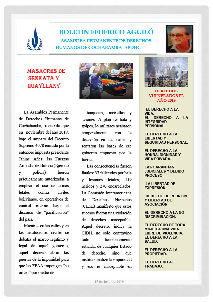 Finalmente, la APDHB exige que los responsables intelectuales y materiales de las 37 muertes registradas en Senkata, Huayllani, Vila Vila, Yapacaní, Montero y otros lugares del país no queden en la impunidad, demandando que asuman su responsabilidad jurídica y política por los hechos ocurridos en noviembre de 2019.