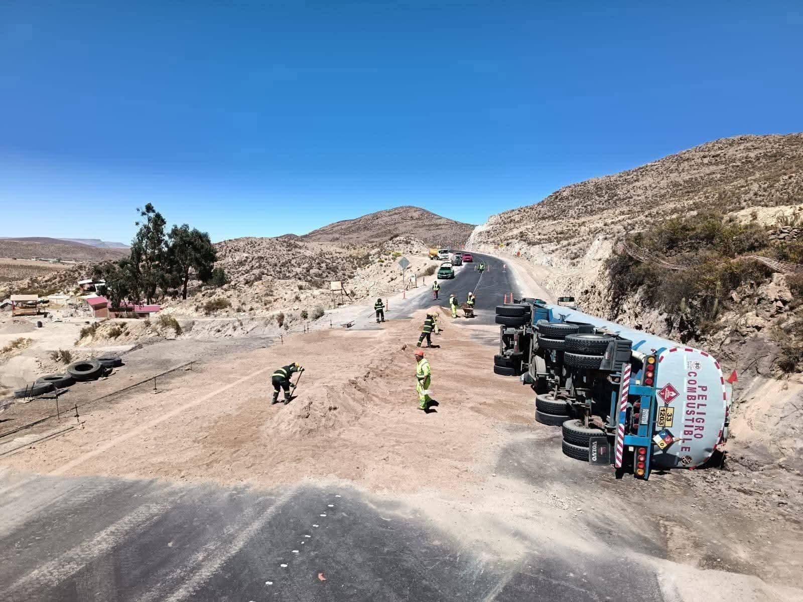 Arica, Chile, 27 de octubre de 2025.- Un camión cisterna con matrícula boliviana se volcó este domingo en la ruta 11-CH, en el norte de Chile, mientras transportaba más de 20.000 litros de gasolina. El accidente provocó un importante derrame de combustible y una rápida movilización de los equipos de emergencia para evitar una posible explosión.