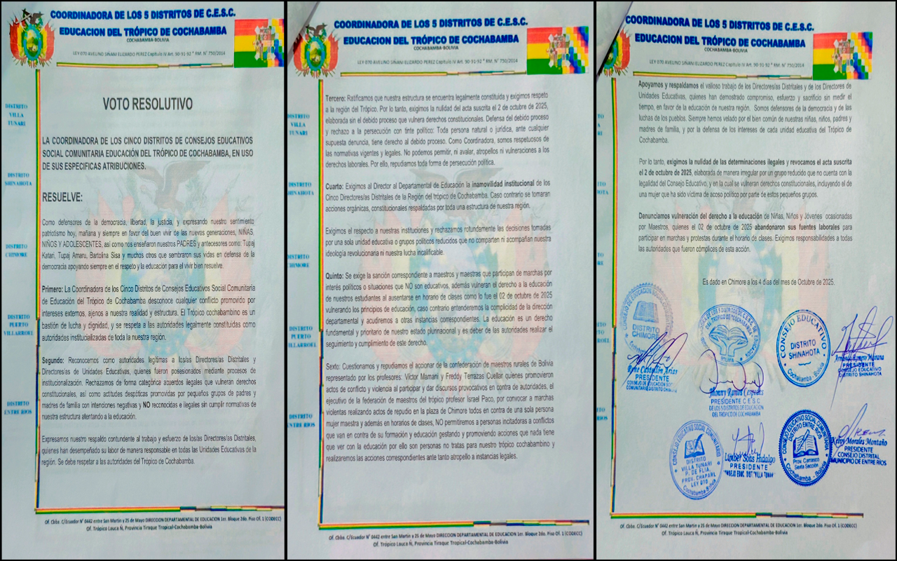 El presidente de la Coordinadora, Johnny Ramos, informó que el pronunciamiento fue respaldado por los presidentes de los Concejos Educativos de los cinco municipios del Trópico. En el documento se demanda la inamovilidad de los cinco directores distritales legalmente institucionalizados, así como una sanción para el grupo de maestros que participó en marchas con fines políticos.