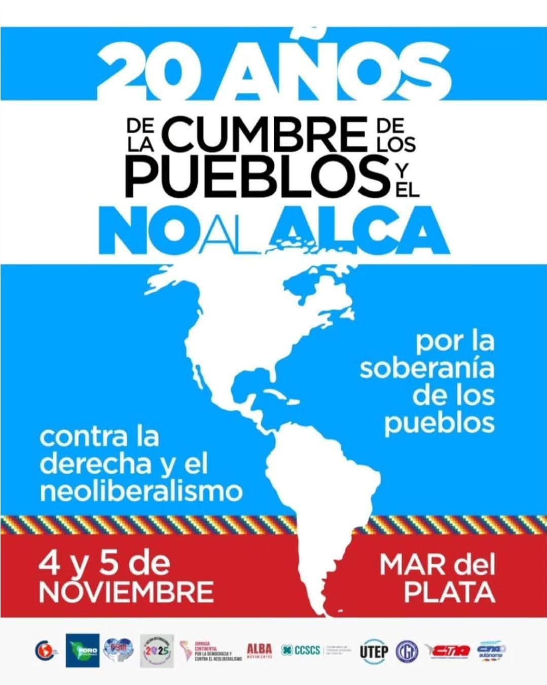 Este 4 y 5 de noviembre, delegaciones de organizaciones sociales, sindicatos y movimientos populares de distintos países de América Latina se reúnen en Mar del Plata para participar en la Cumbre de los Pueblos: A 20 años del No al ALCA, conmemorando la histórica gesta que en 2005 frenó el proyecto de libre comercio impulsado por Estados Unidos.