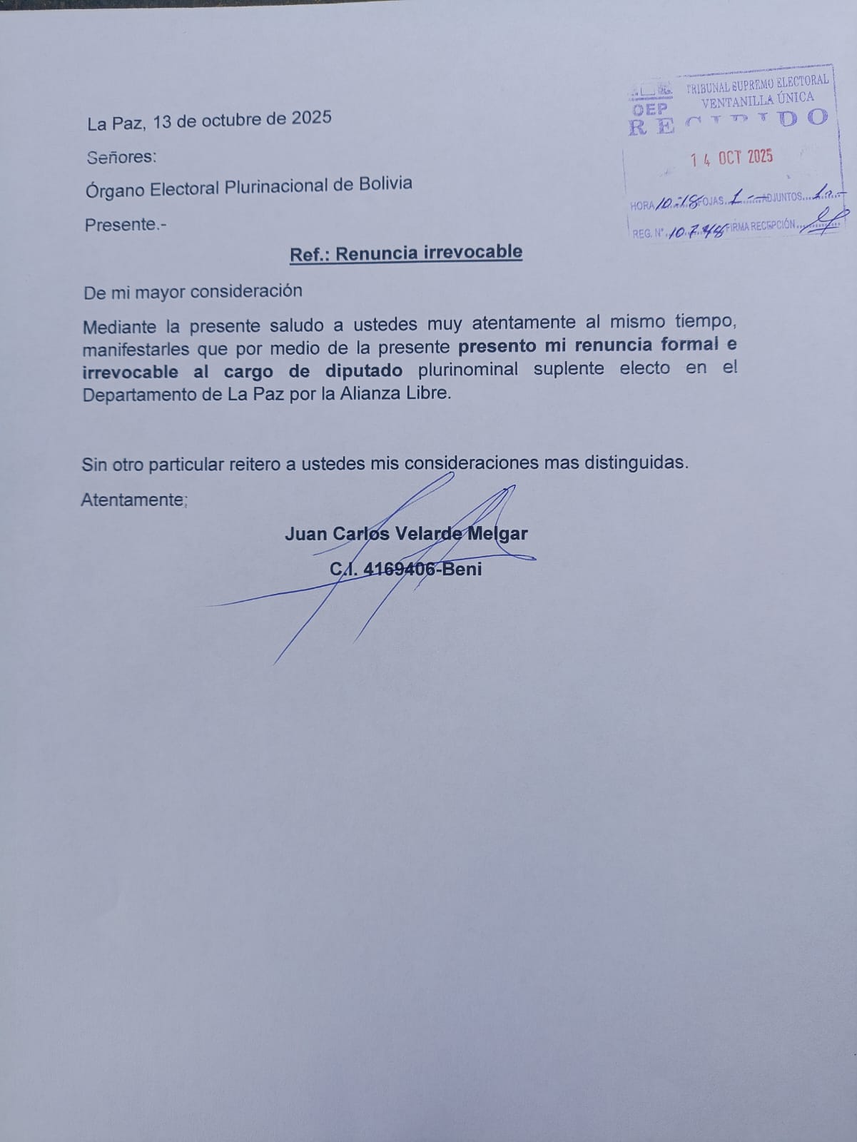 La Paz, 14 de octubre de 2025 .- Ante la ola de críticas generadas por sus recientes declaraciones en un debate en vivo vía redes sociales, el diputado suplente electo por la Alianza Libre, Juan Carlos Velarde, presentó una carta de renuncia irrevocable dirigida al candidato presidencial Jorge “Tuto” Quiroga, en la que también formula disculpas públicas.