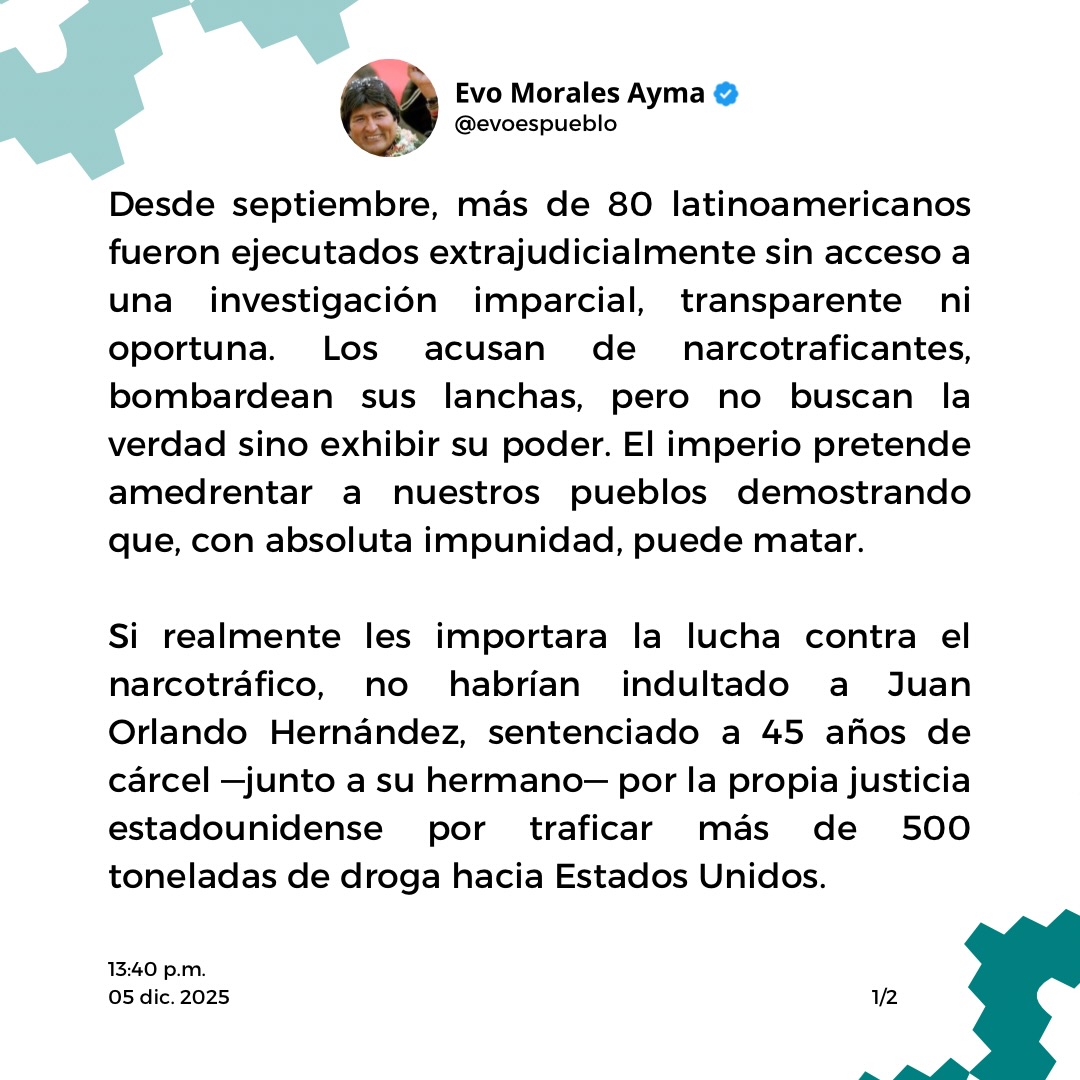 Lauca Eñe, 5 de diciembre de 2025 .- El expresidente de Bolivia, Evo Morales Ayma, denunció a través de su cuenta en la red social X la presunta ejecución extrajudicial de más de 80 latinoamericanos desde septiembre, en el marco de operaciones antidroga realizadas fuera de procesos transparentes y sin investigaciones imparciales.