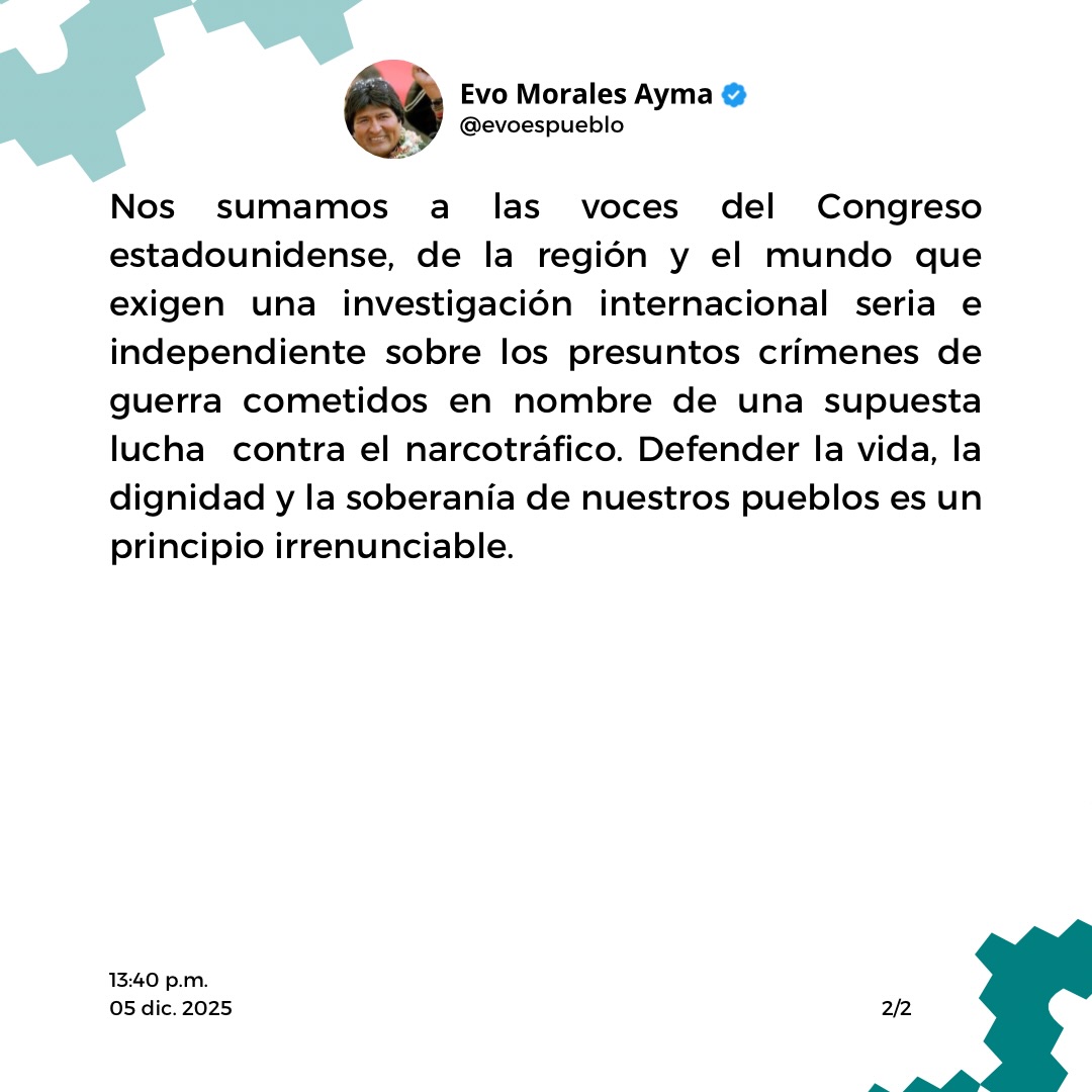 Según Morales, estas personas fueron acusadas de narcotraficantes y sus embarcaciones “bombardeadas”, acciones que, afirmó, buscan demostrar poder antes que esclarecer la verdad. “El imperio pretende amedrentar a nuestros pueblos demostrando que, con absoluta impunidad, puede matar”, expresó en su publicación.