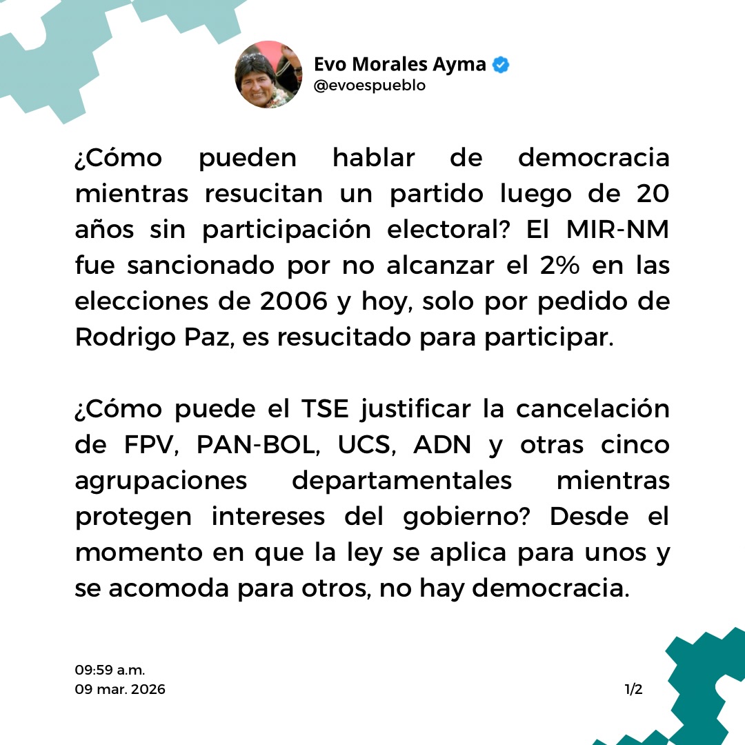 Lauca Eñe, 09 de marzo de 2026 .- El expresidente de Bolivia, Evo Morales, cuestionó duramente al Tribunal Supremo Electoral (TSE) y al gobierno del presidente Rodrigo Paz Pereira, tras denunciar que se estaría permitiendo la participación del partido Movimiento de la Izquierda Revolucionaria - Nueva Mayoría (MIR-NM) pese a haber perdido su personería jurídica hace casi dos décadas.