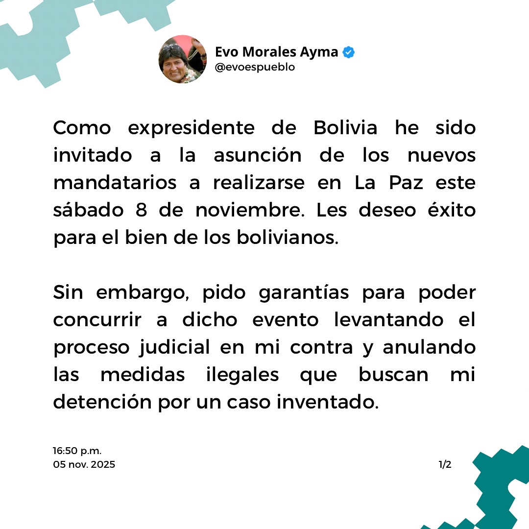 El expresidente Evo Morales Ayma informó a través de su cuenta oficial en la red social X (antes Twitter) que fue invitado a participar en el acto de posesión de los nuevos mandatarios del Estado Plurinacional, realizado este sábado 8 de noviembre en la ciudad de La Paz. En su mensaje, Morales expresó sus buenos deseos hacia las nuevas autoridades, al señalar: “Les deseo éxito para el bien de los bolivianos.”