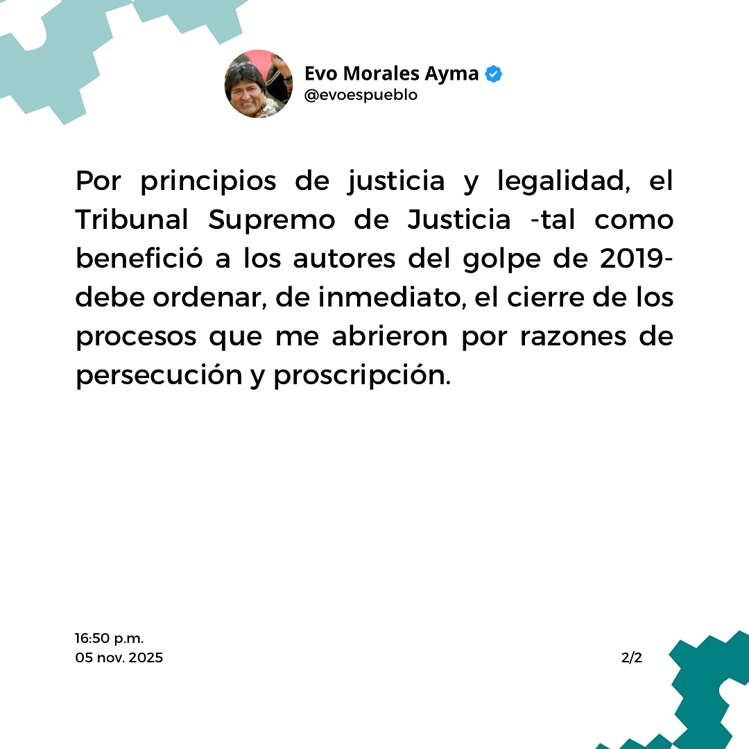 “Por principios de justicia y legalidad, el Tribunal Supremo de Justicia —tal como benefició a los autores del golpe de 2019— debe ordenar, de inmediato, el cierre de los procesos que me abrieron por razones de persecución y proscripción”, manifestó Morales en su publicación.