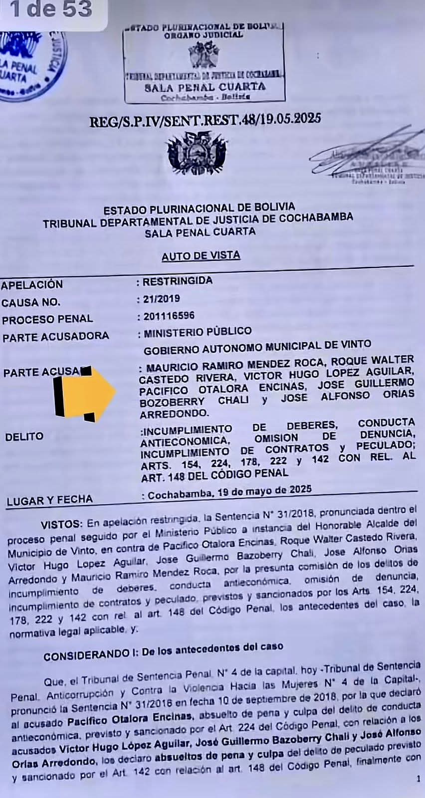 Cochabamba, 07 de octubre de 2025 .-La sala penal cuarta del tribunal departamental de Cochabamba ratifica tres años de cárcel en contra del expresidente de la Liga, Mauricio Méndez Roca, quien junto a otros dirigentes utilizó un trámite de reforma agraria para apropiarse de los terrenos del CAR de Vinto, en Cochabamba.