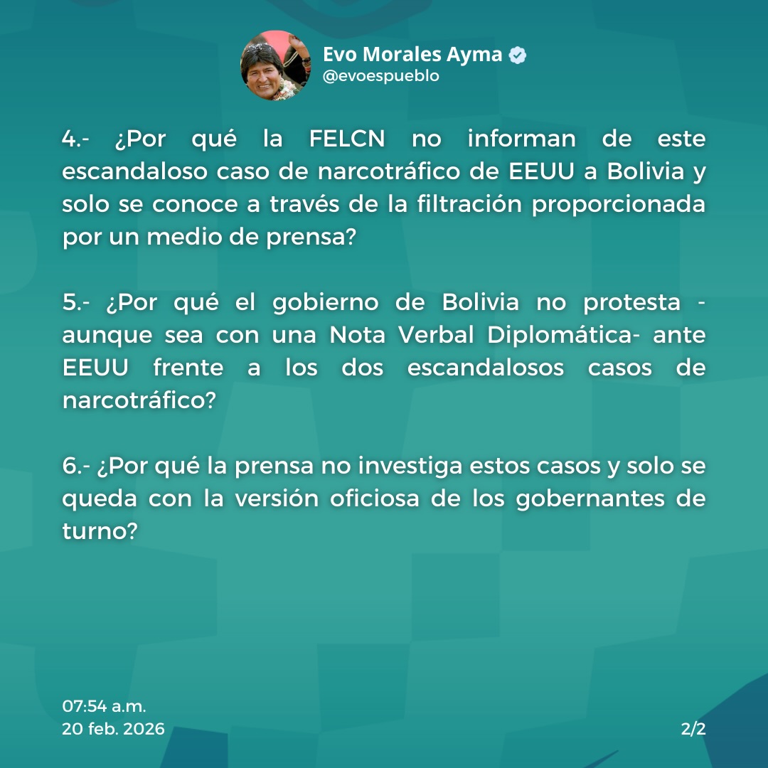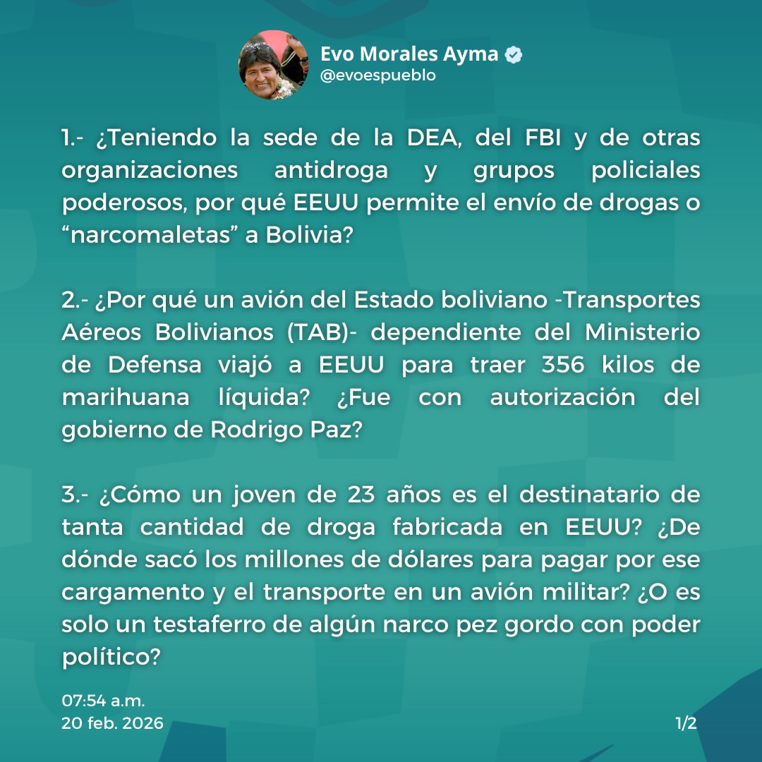 Lauca Eñe 20 de febrero de 2026 .- El expresidente Evo Morales lanzó una serie de interrogantes públicas a través de su cuenta en X, en torno a un presunto caso de narcotráfico que involucra el traslado de droga desde Estados Unidos hacia Bolivia.