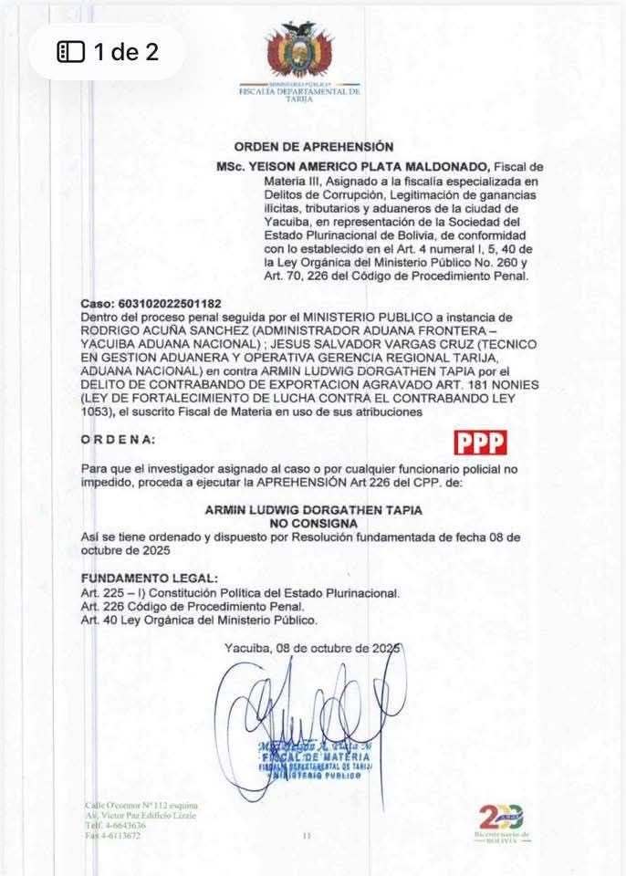 La Paz, 9 de octubre de 2025.- La Fiscalía General del Estado emitió una orden de aprehensión contra Armin Dorgathen, presidente de Yacimientos Petrolíferos Fiscales Bolivianos (YPFB), en el marco de una investigación por el presunto delito de contrabando de exportación agravado. La medida —informada por medios nacionales— se habría activado tras una denuncia presentada por la Aduana Nacional relacionada con exportaciones de combustible que, según la acusación, tendrían un valor estimado en millones de dólares. La Policía puso en marcha un operativo para dar cumplimiento al requerimiento judicial.