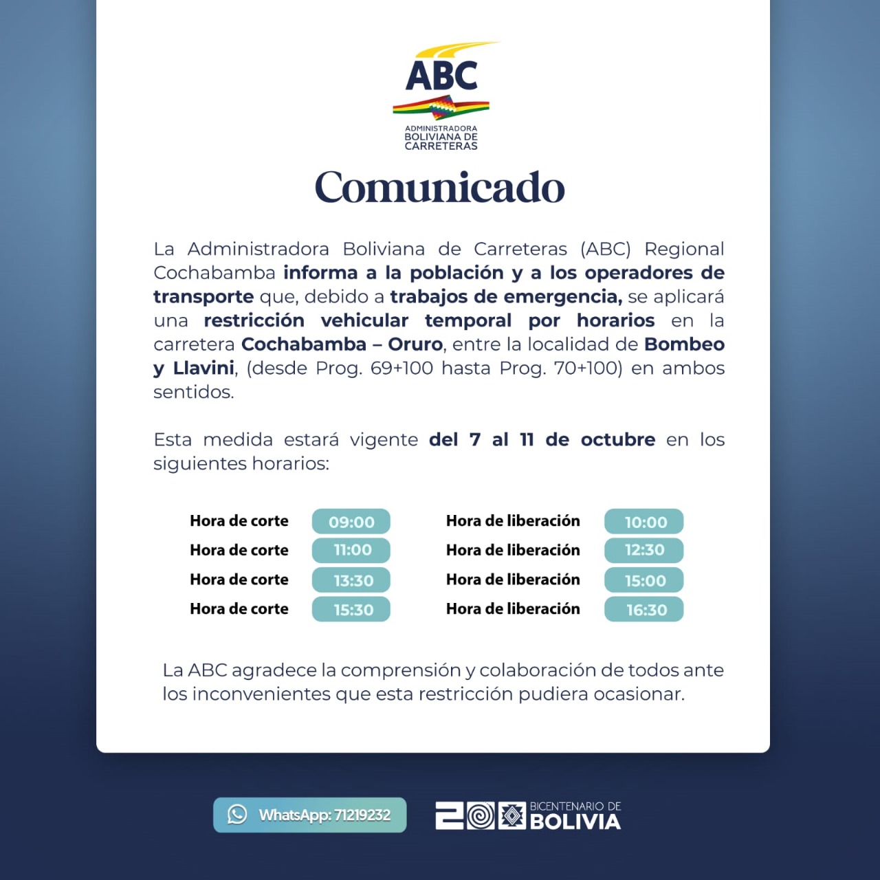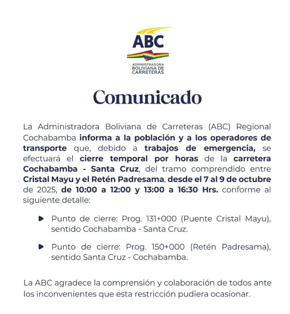 Cochabamba, 6 de octubre de 2025.- La Administradora Boliviana de Carreteras (ABC), Regional Cochabamba, informa a la población y a los transportistas que se realizarán cierres y restricciones temporales en dos importantes tramos viales del departamento, debido a trabajos de emergencia necesarios para preservar la seguridad vial y garantizar la estabilidad de las plataformas afectadas por deslizamientos y deterioro.