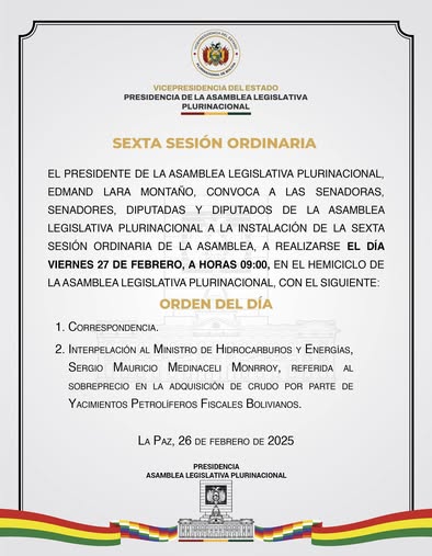 Según la convocatoria difundida por la Vicepresidencia, la sexta sesión ordinaria está programada para este viernes, a las 9:00, en el hemiciclo legislativo de la ciudad de La Paz.