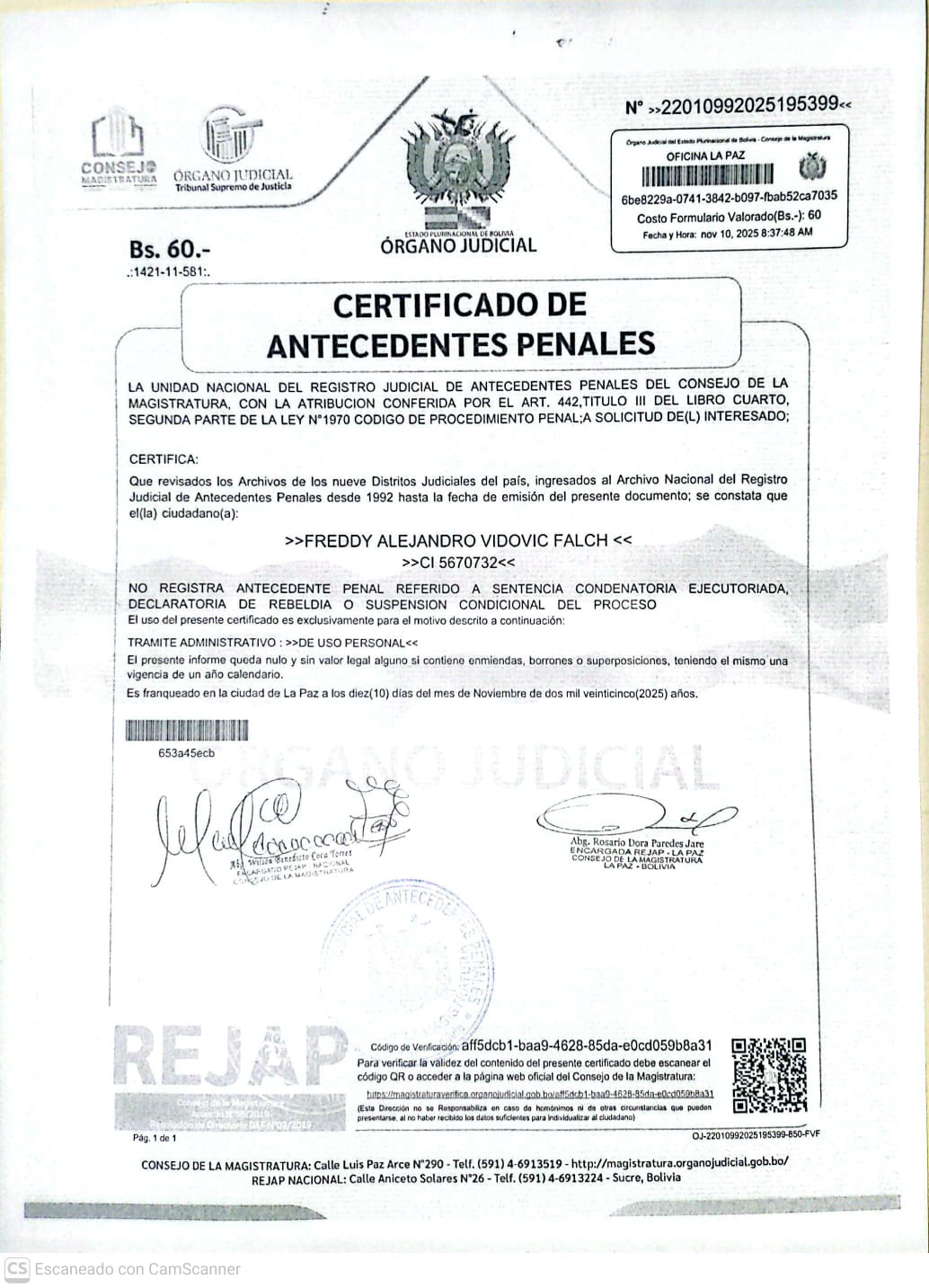 El documento, emitido por la Unidad Nacional del REJAP y validado con código de verificación oficial, establece de forma expresa que Vidovic no registra condenas, rebeldías ni suspensiones condicionales de procesos. La certificación tiene vigencia legal por un año y abarca la revisión de los archivos judiciales de los nueve distritos del país desde 1992.
