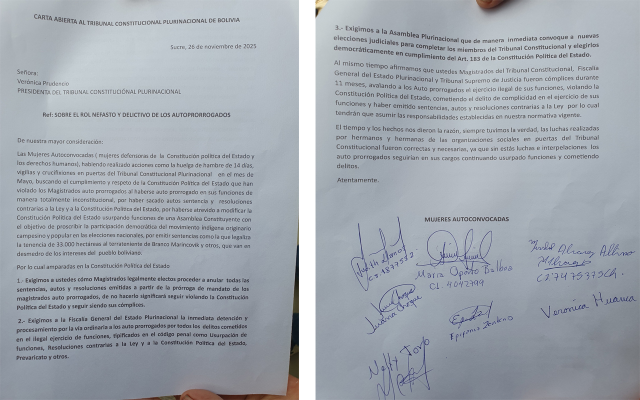 Sucre, 26 de noviembre de 2025.- Un colectivo de Mujeres Autoconvocadas, defensoras de la Constitución Política del Estado y de los derechos humanos, presentó este miércoles una carta formal dirigida a la presidenta del Tribunal Constitucional Plurinacional (TCP), Verónica Prudencio, en la que exigen la nulidad de pleno derecho de todas las sentencias, autos y resoluciones emitidas por los magistrados autoprorrogados durante los últimos 11 meses.
