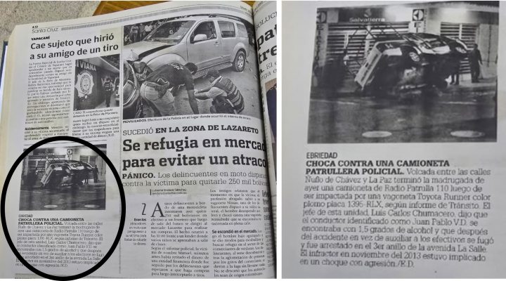 Ese diario dice que luego de impactar con el vehículo policial, Juan Pablo Velasco huyó del lugar de los hechos, pero fue arrestado entre la avenida La Salle y Tercer anillo, en esa ocasión, conducía un vehículo marca Toyota Runner con placa de control 1395-RZX.